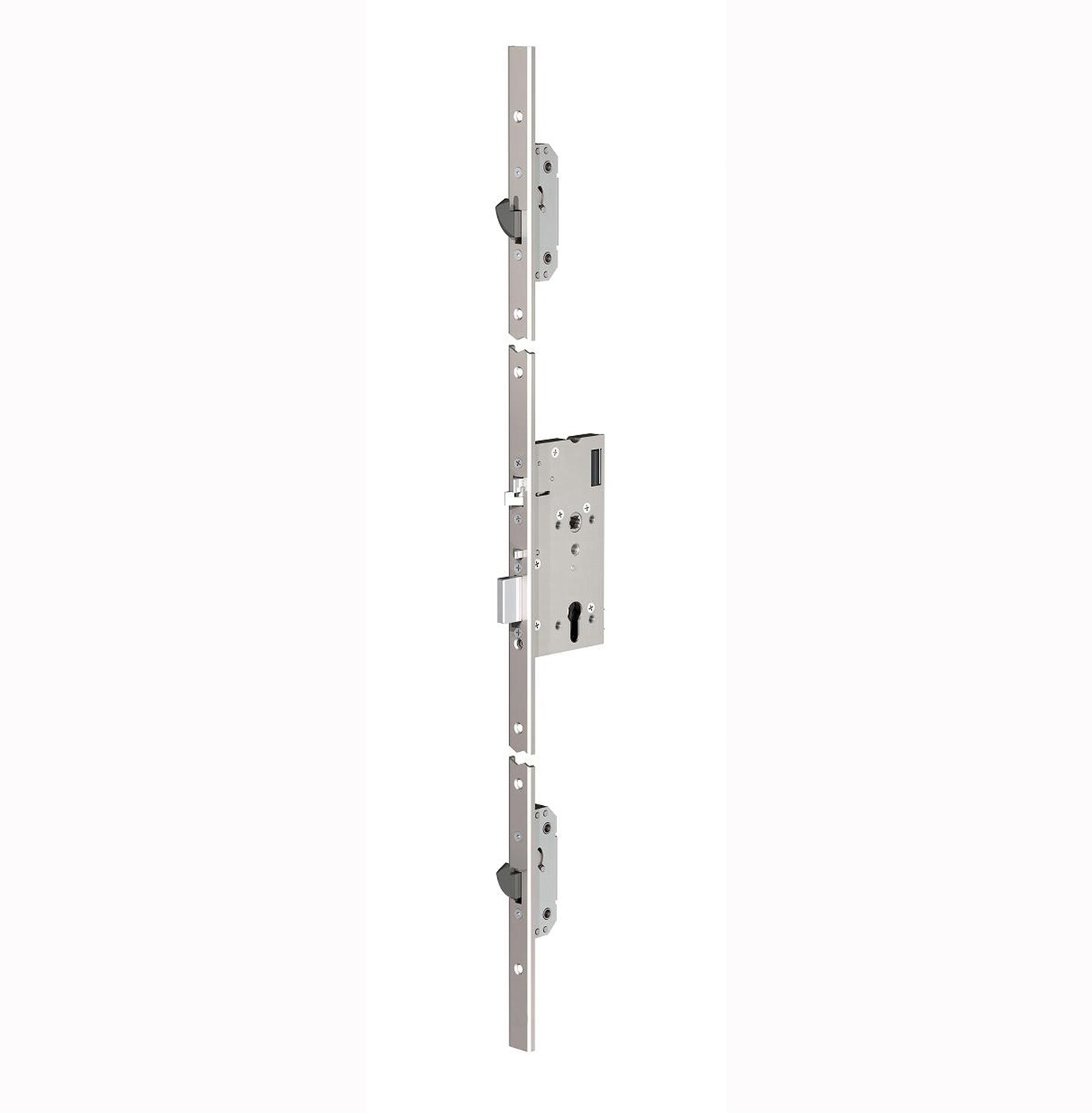 Замки с многоточечным запиранием включают главный моторный замок в середине, на базе ABLOY EL532 и два вспомогательных замка с ригелем крюком. У всех трёх замков одна передняя планка и управляются главным замком в середине.